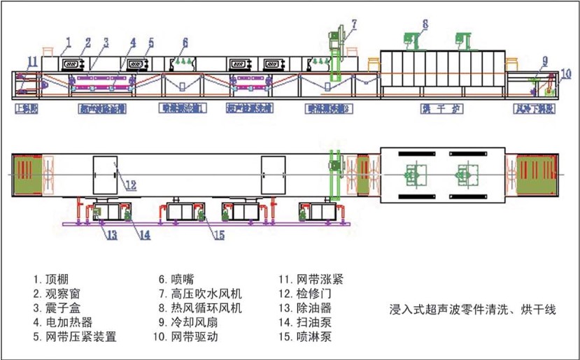 由機(jī)架、頂棚、超聲波除油槽、噴淋漂洗槽1、超聲波漂洗槽、噴淋漂洗槽2、循環(huán)副槽及過濾系統(tǒng)、油水分離系統(tǒng)、高壓風(fēng)機(jī)吹水系統(tǒng)、烘干爐、風(fēng)冷系統(tǒng)、傳動(dòng)輸送系統(tǒng)、工件籃、電氣控制系統(tǒng)等組成。